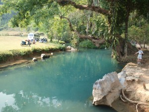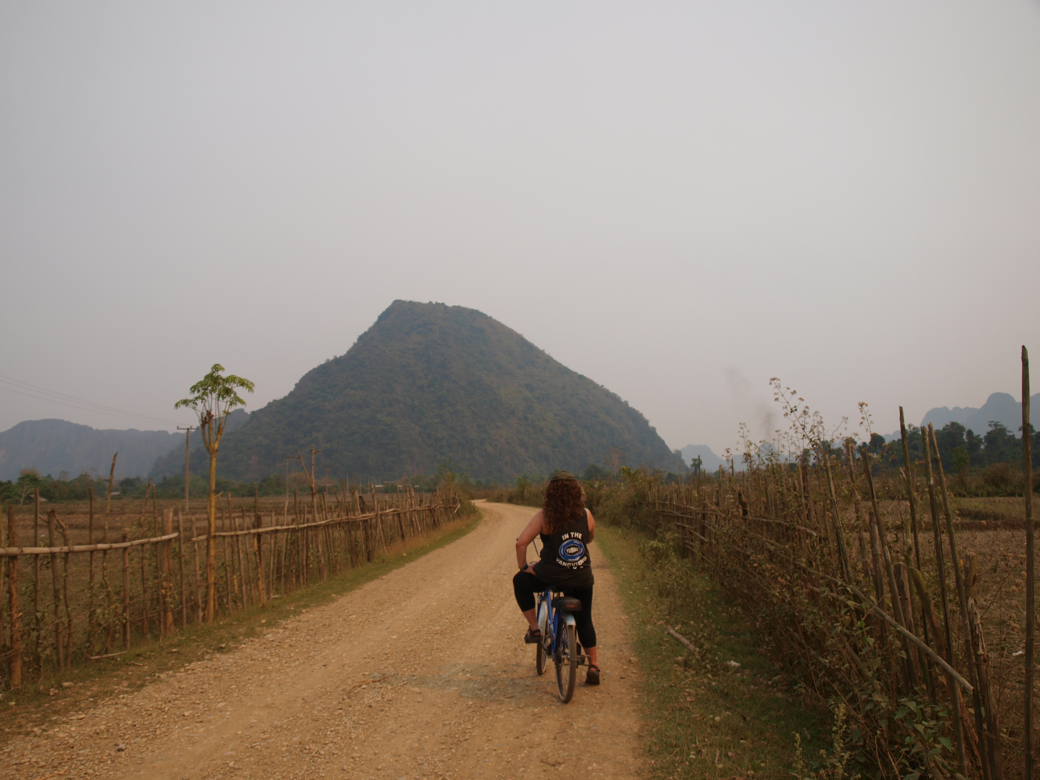 After a couple more chill days and one more crazy day on the river, Kim and I needed a change of pace (and some exercise). We decided to rent bicycles and take a ride through the surrounding villages over to the Blue Lagoon, a small natural pool about 7km out of town. The scenery was incredible and other than the fact that we rented cruisers instead of mountain bikes, it was a great trip. But yeah, cruisers with crappy breaks on unpaved roads were not the best choice. Kim actually thought she was going to die flying down some of the hills!