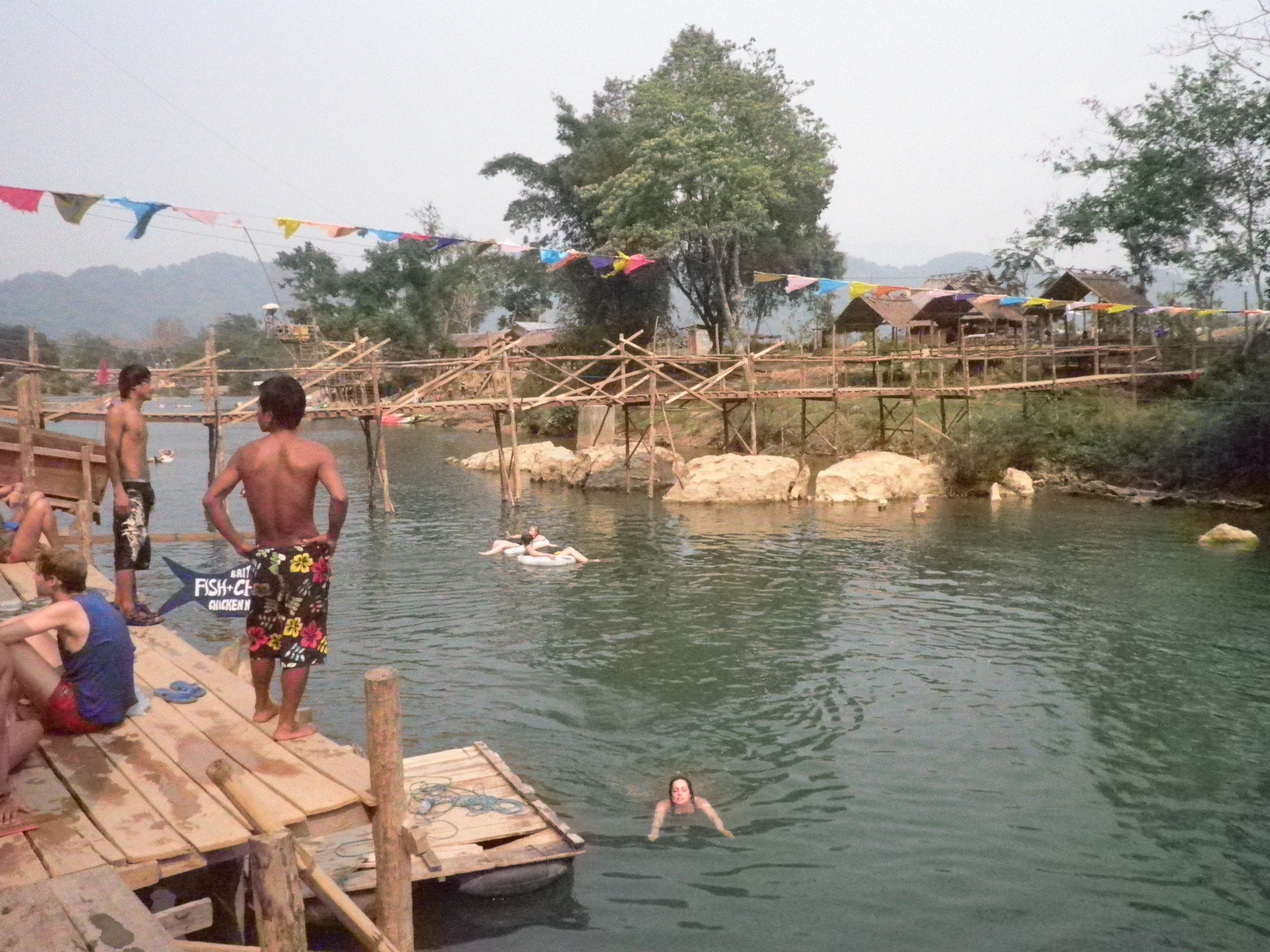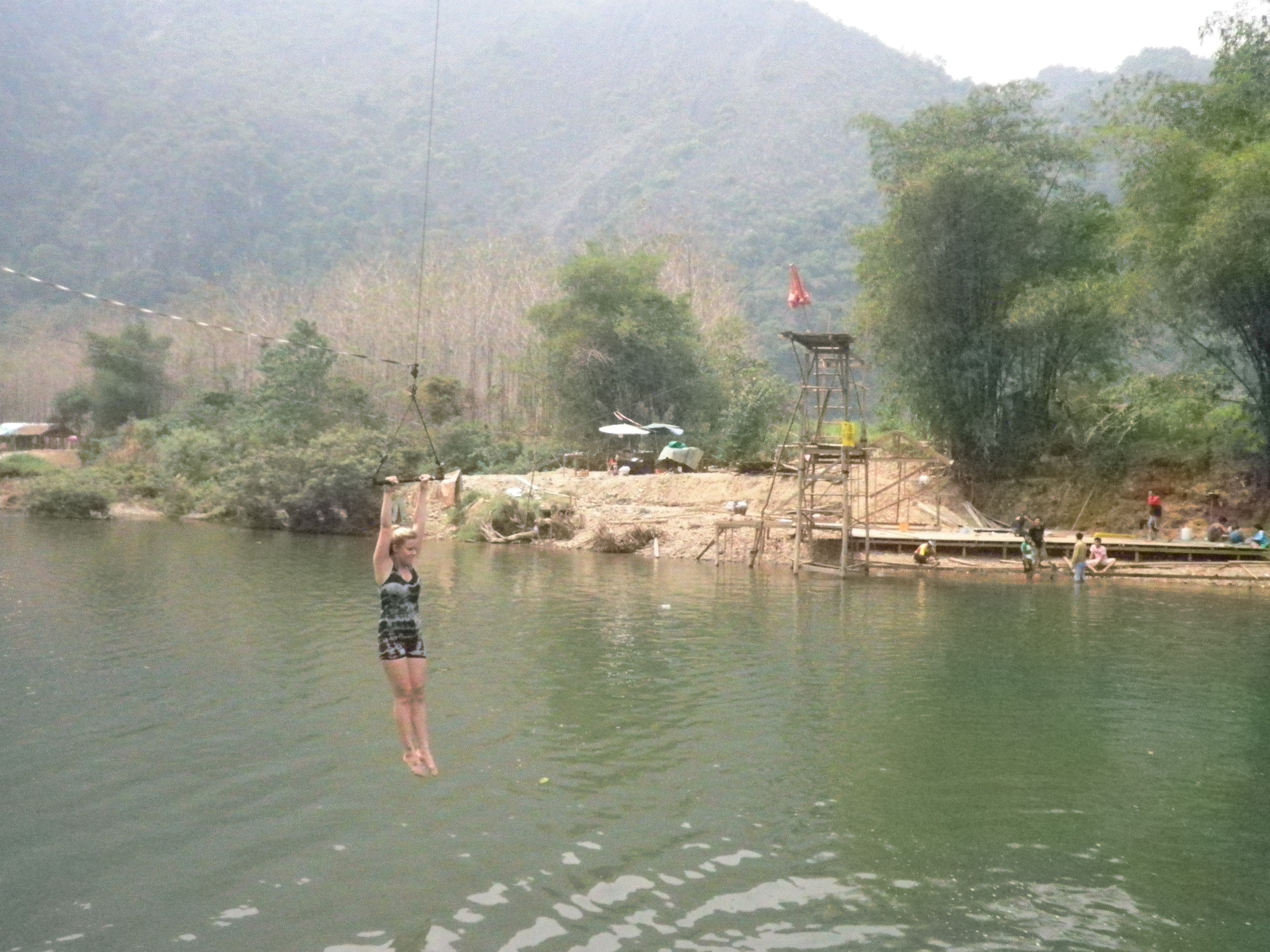 The dancing Lao boys are waiting on the docks and they toss out a line for you to grab and they pull you in to come join the fun. You are usually welcomed with a free shot of Tiger whiskey (terrible!-but hey, its free!) and led to the bar. All the bars also have these crazy high “rope” swings or insanly huge slides for you to ride. Kim and I might have partook, however, tons of people injure themselves on these everyday. Depending on your water landing (and the amount of alcohol that is usually comsumed beforehand) so much can go wrong. Faces split open (this actually happened to a buddy of ours that week), broken bones, and a worse case senario, one of Megan’s friends had to have his foot amputated a few years ago!! So yeah, Kim and I sat back and took photos while Megan took a chance and went for a ride. 20 yrs old vs. 30ish yrs old:)