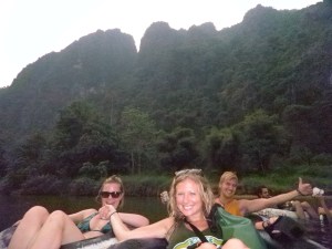 After our nice relaxing time in Luang Probang, Kim, Megan and I moved on to the infamous party town of Vang Vieng. The main (and almost only) attraction here is tubing down the Nam Song River. Now, many of you may know that most people from Texas are experts at tubing. We take numerous trips down the Guadalupe or Comal River in New Braunfels every summer. But here in Laos, its done a little differently. Instead of packing up your own ice chest full of booze and attaching it to your tube, the river is actually lined with tons of bars for you to stop at and quench your thirst.