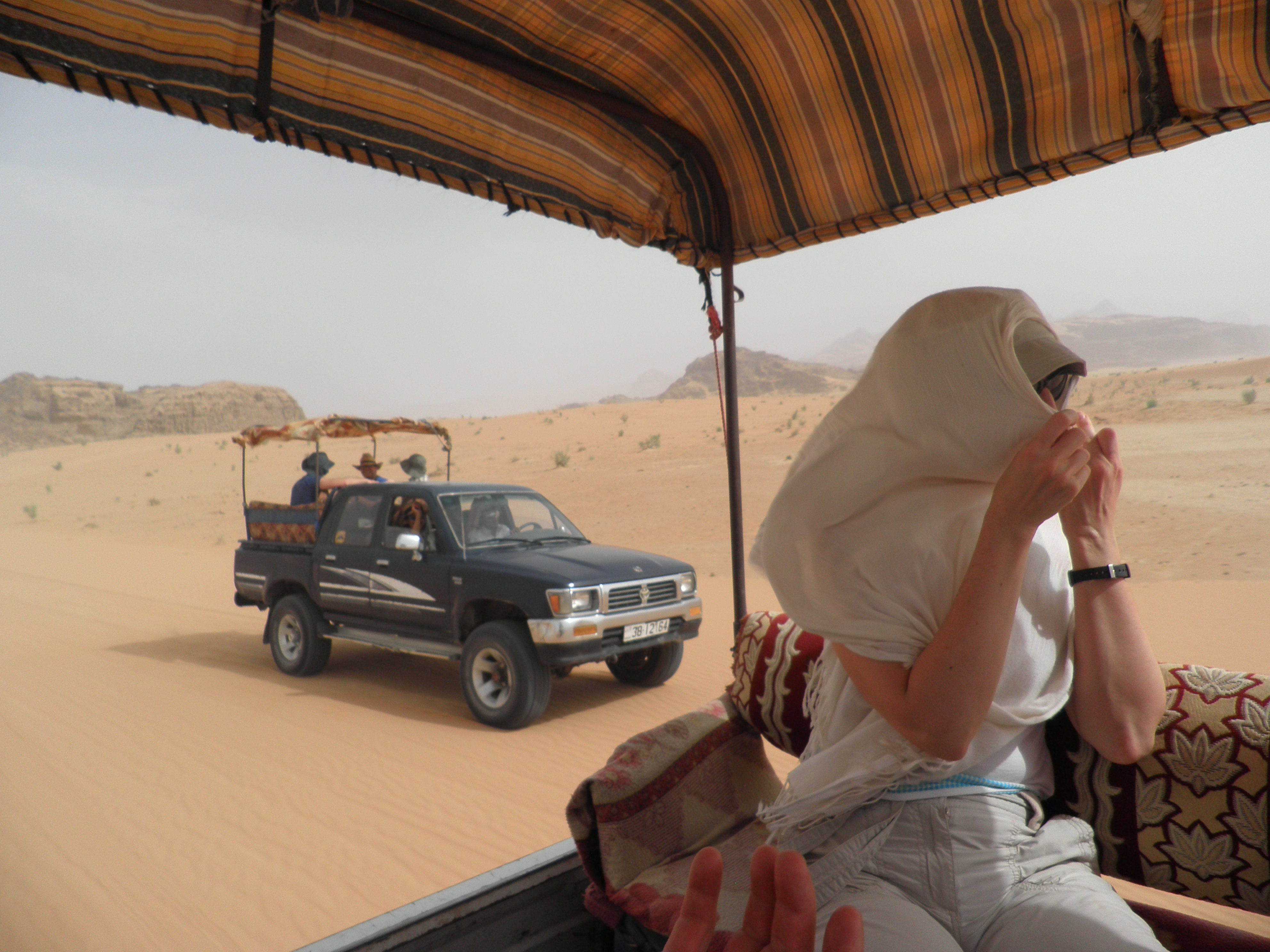 The following morning we continued down the King’s Hwy and into the Wadi Rum desert – 720 square kilometer preserve of desert wilderness and mountains. I was super pumped for our ‘desert jeep safari’ and spending the night in a Bedouin camp under millions of desert stars. Of course, Kelly and I have had nothing but great luck with the weather on this trip, so the day that we were set to spend in Wadi Rum, there was a fricken SAND STORM. We still had our jeep safari, speeding over sand dunes, dodging camels (yes, there were a ton of camels just chillin’ in the desert), and attempted to watch the sunset, but didn’t have much luck with the views (or photos for that matter) as the sand in the air created a hazy cloud across the whole area. It was a bit of a let down, but what can you do?