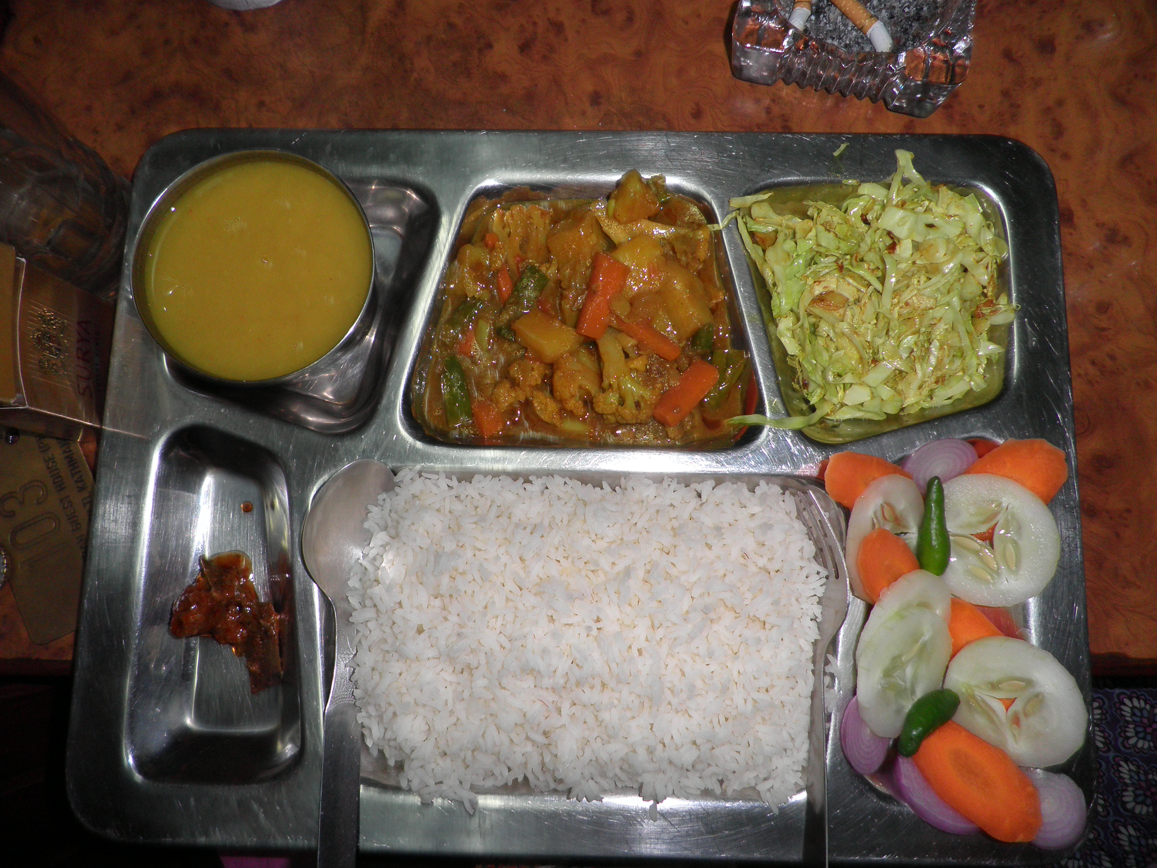 The primary dish in Nepal is dal-baht. This meal consists of steamed rice, lentil soup, a vegetable curry, and some sort of spicy pickled chutney. Locals eat this dish every day, both for lunch and dinner. It’s very tasty, and while trekking, Kelly and I ate it everyday for at least one of our meals.